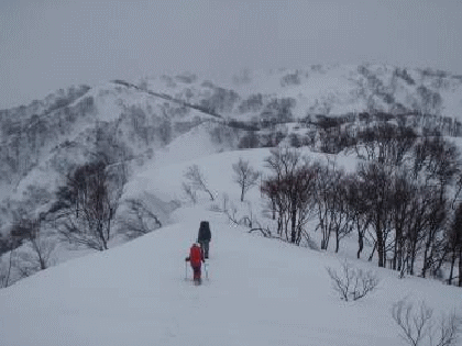主稜線に上がると風が強くなる。体に張り付くようなジトジトした小雨が降っている。雪は重く湿っており、ダンゴ状に雪が付いたワカンでのラッセルは大変の一言。折居山への急登でヘトヘトになってしまった。当初は松平山を抜けたあたりで幕営と考えていたが、金鉢山を越えたら幕営地を探しながら歩くことにする。久しぶりの折居山は風雨の中。高い山々はガスにまかれ、飯豊方面の展望は楽しめずとなった。