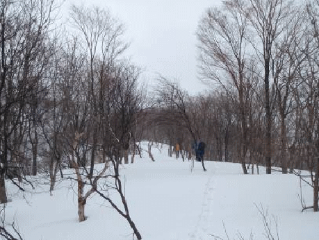 遅場集落で待ち合わせ、山スキー2人、スノーシュー4人、ワカン3人の総勢9人で出発する。天気は冬型で雪模様の予報だが、歩き始めは青空も顔をのぞかせてくれていた。杉林を抜け、450mピークまでがものすごい急登。鞍部を目指すが、ガケを登るようだ。