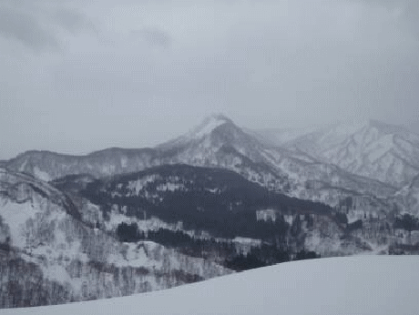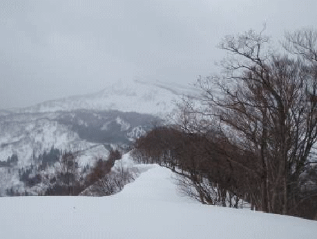 ピークからは杉林の中をいったん下る。あとは尾根上に緩やかに行くだけだ。端正なブナ林が美しい。昨年来たときは感じなかった、小さなアップダウンを越えて向かう。クラストしている急斜面を登り切ると山頂だった。ガスはそう深くない。守門岳方向も薄っすらと見え、尖った番屋山がそそり立って見える。風が冷たく寒いので、山頂直下の風当たりが弱そうなところにテントを張り、昼食とする。その間に天気はどんどんと悪くなり、冷たいみぞれ交じりの雨となっていた。