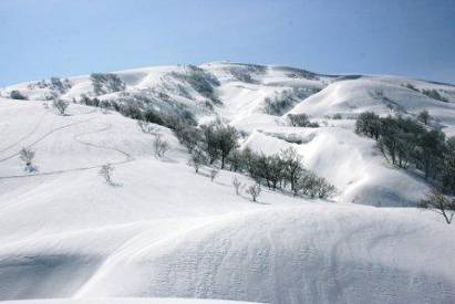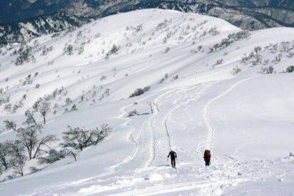 標高1000付近からは視界が開け、正面に白鳥山がドーンと広がる。他人のシュプールを気にせずどこでも滑れそうな広大な斜面だ。鳥居杉は一面の雪原の中でいい目印になる。鳥居杉からわずかな登りで栂海新道のある広い尾根に出る。