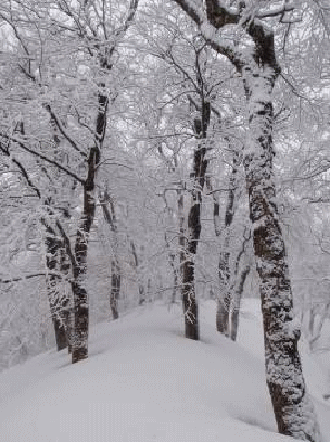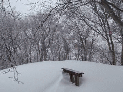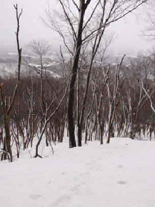 524mのピークまで1時間半で登ることができた。ここで胎内川からの夏道にぶつかることになので、赤テープや目印などが目に付くようになる。道はいったん下ってから先回の最終地点540mピークに向かう。今回はピークをショートカットし、鞍部を目指す。そして、尾根上の道を行く……どうもおかしいとコンパスを見ると、違う尾根に入ってしまっていた。道を乗っ越してしまっていた。登るにつれ雨が雪に変わる。木々に付いた雪が粉砂糖を振りかけたみたいで美しい。