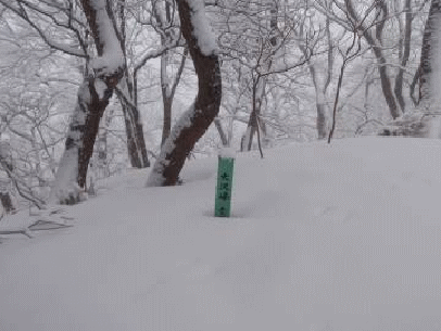 正規のルートに戻る。雪がスノーシューにダンゴ状に付き、重くて歩きにくい。蔵王権現からの道と合わさるピーク、531mのピークと、ピークでは地図で方角を見ながら注意して進むことにする。間違うと登り返しがつらく、疲れが倍増する。山頂に近づくにつれ、「大沢山」の木柱や縄の柵など人工物が出てくる。そして、2週間前に登った下荒沢からのルートでぶつかる550mピークに着いた。その時に付けたテープがガスの中、頼もしい存在で揺れていた。