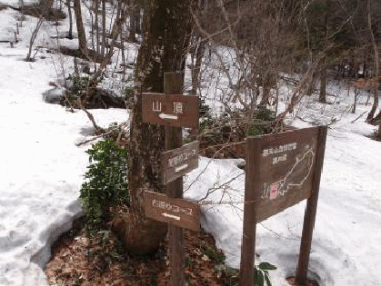 途中、立派な東屋が建っていたり、道標がしっかりと付けられている。分岐(高坪の分岐というらしい)から右廻りコースを行く。日当たりのよい急斜面には雪が解けているので、ワカンを付けたはいいが、歩きにくい。急斜面を登り切ると尾根上の道となり、荒川の運動公園からの道と合わさる蔵王分岐となった。