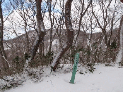 天気は予報よりも良く、海のほうに視界が開けている。今冬4回目の登頂になったが、一番良い天気となった。下りは蔵王権現からのルートをとりたいので、縦走路を先に行った、550mピークの中峰で大休止となった。山頂からの縦走路には薄っすらとワカンのあとが確認できる。10日前の私たちのトレース跡だろうか。
