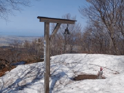 山頂も雪が減っていた。私が付けた目印テープは天高く揺れている。もう少しでお地蔵様の周りの雪もなくなるだろう。展望を楽しみ、周回コースへと進む。深雪の時はなかった道標も現れている。春の雪解けのスピードはすさまじい。