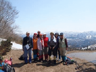 展望台を越え、蔵王集落からのコースが合流する分岐となる。3週間前に来た時は冬景色の中、ワカンを付けて登ってきたのに、だ。雪は消え、乾いた夏道となっていた。ここからはブナ林となる。雪が出始めたら、高坪山頂に着いた。駐車場から1時間10分。雪がないと、あっけなく着いてしまった