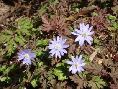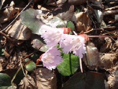 陽気に誘われ、また、高坪山に向かう。虚空蔵山荘からの一周ルートだ。出発したのが遅かったので、駐車場にはたくさんの車が止まっていた。沢を渡り、高坪山への尾根に取り付く。雪がない!山はすっかり春の風情になり、山桜やキクザキイチゲ、ショウジョウバカマ、イワウチワが咲き始めていた。