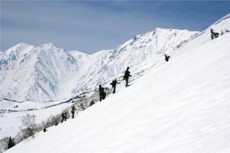 ゴンドラとロープウェイを乗り継ぎ、登り口に着いたときにはすでに9時40分だった。晴天のうえ風もなく絶好のツアー日和で登山者が続々と天狗原に向かって登って行く。ヘリコプターもスキーヤーやボーダーを天狗原に運んでいる。天狗原からは、そのまま栂池スキー場に戻る人、白馬乗鞍に登る人、蓮華温泉へ行く人、風吹大池方面に向かう人等々さまざまだ。