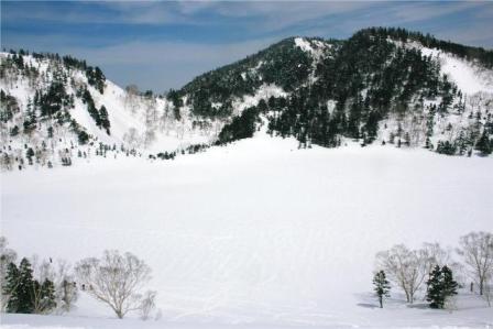 《雪の風吹大池、後方は横前倉山》