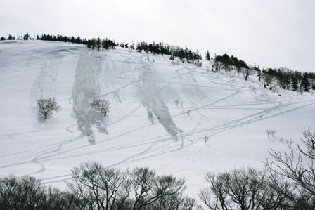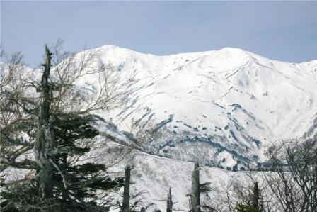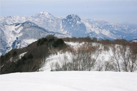 箙岳の直下の急斜面は雪の状態が悪い時には新潟県側のダケカンバの林を下った方が無難だ。