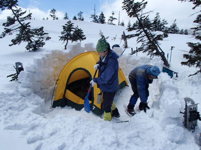 ここでOGがスノーブロックを積むという大技を披露した。雪の塊を四角に掘り出し、手際よく積んでいった。他の二人も見よう見まねで同じことをするが綺麗な四角の塊にならない。いつこんな技術を習得したのか、今までテンバの設営は足で踏んで整地するだけであったが、今回はOGの主導で、立派なテンバが出来上がった。