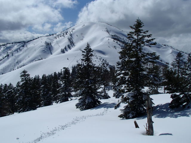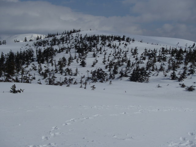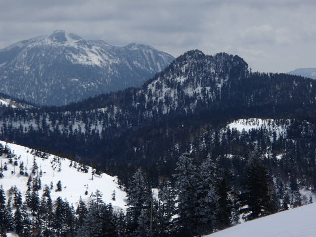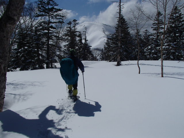 時間はまだ午後2時半前。天気も良いので、今日の内に赤倉岳にアタックすることにし、出発する。昨日降ったと思われる綺麗な新雪を踏み、樹間越に赤倉岳を見ながら、標高で約200m下って登り返す。