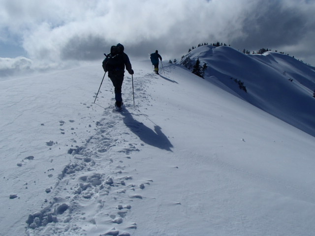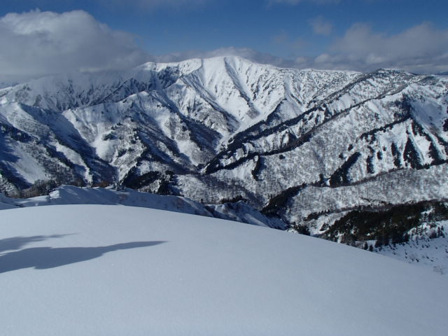 先行に三人パーティがいるのが見える。一人はスキーだ。憧れていた赤倉岳の山頂がどんどん近づいてくる。山頂部の東の峰の手前で先行のパーティが降りてきてすれ違う。我々よりずっと若い男性3人組だ。スキーの人は気持ち良さそうに。最高のコンディションの斜面を滑り降りて行った。