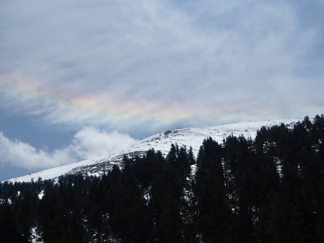 しばらく景観を楽しんだ後、猫又川の奥の右俣と左俣の間に降りる尾根を下る。尾根の取り付き地点まで降りたところで昼食休憩を取った。山の鼻小屋へ向かって尾瀬ヶ原の雪原を歩く。至仏山に彩雲が出ていた。ありふれた現象らしいが、初めて見て感動する。尾瀬ヶ原越しに見る燧ヶ岳も美しく最後まで楽しめた。