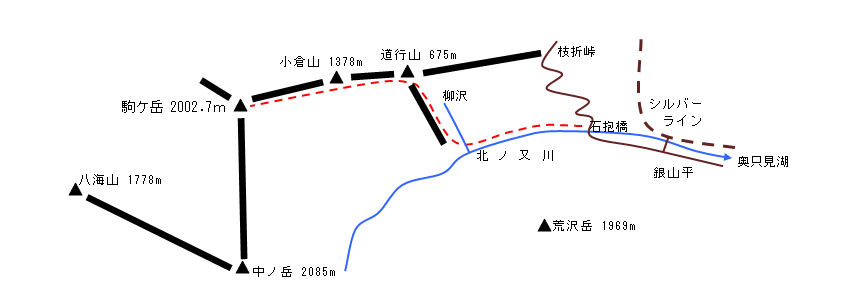 石抱橋7:05 − 7:50柳沢出合 − 9:30道行山 − 12:20駒ケ岳12:45 − 13:40道行山 − 14:10柳沢出合 − 14:50石抱橋
