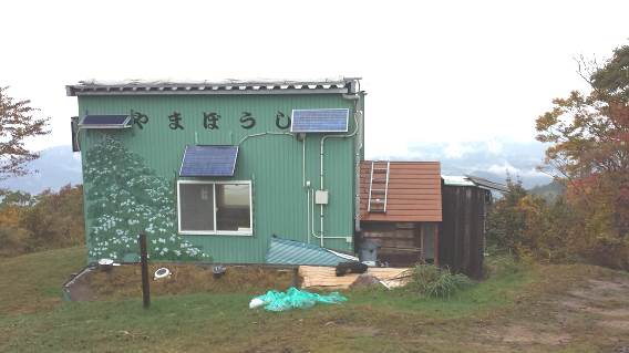 きのこを採りながら登るつもりだったが、全く収穫なく1時間もかからずに着いてしまった。山頂には祠と「やまぼうし」と「豆の木小屋」という2つの小屋がある。どちらも大きくはないが、設備も整い清潔にされていて素晴らしい小屋だ。