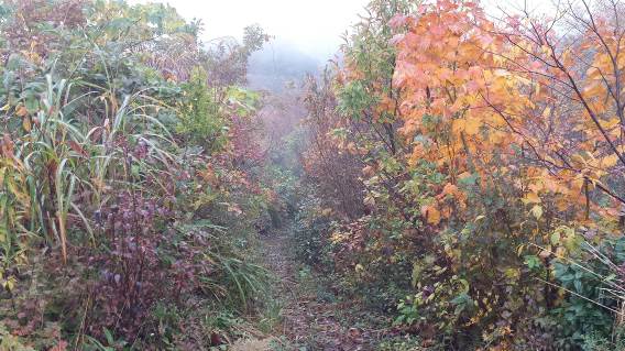 雨の降る中、紅葉も見ごろとなった起伏の少ない稜線を歩き始める。しばらくして急な登りを少し行くと展望台のある赤尾八石山に着くが悪天で視界は効かない。いったん少し下ってから階段のある道を登ると514mの山頂に到着する。