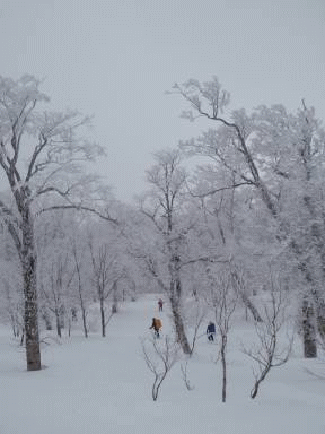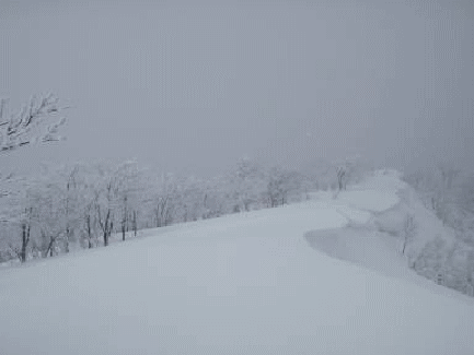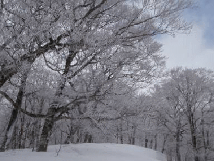 ブナ林には雪がよく似合います。雪をまとったブナの木々は美しいの一言で、何度歓声を上げたことでしょう。思い描いていた光景が広がり、展望は楽しめなくても十分に雪山を満喫できるのです。思いのままに下り、あっという間に車道に着いてしまいました。ですが、そこから車までがことのほか辛く、できるなら避けたいものとなりました。