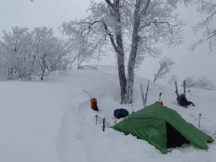 本峰まで行きたかったのですが、「今回はここまでじゃ。これから昼の宴の準備に取りかかろうぜい!」との号令で、今回は標高1455mの王博士までとなりました。昼の宴は最重要となります。そそくさと王博士の直下でテントフライを張りました。フライの中でガスコンロを点けると、暖かい別天地となります。相変わらず博士山のガスは晴れてくれません。白い尾根が続く向こうにはどのような景色が続いているのでしょう。