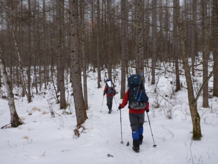 翌朝、外は雪が降っている。気温は低く、テントの中はバリバリ、水物はすべて凍っている。なんとなくテンションが上がらず、のろのろと支度をして出発したのは8時近くになっていた。先行が2人いたが、すぐに追いつき追い越す。新雪であるが、下は踏み固められているので登山道を外さなければそう沈まない。