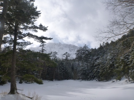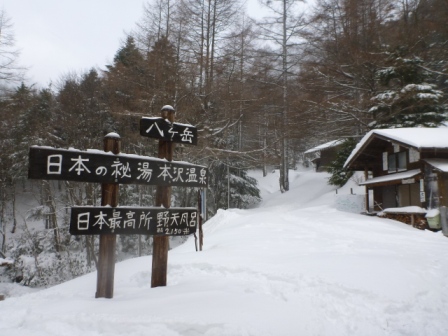 目の前にはみどり池と書かれた標識もあるが当然のごとく現在はただの雪原である。さらに歩をすすめるが空は雲が鉛色を増し、本沢温泉に到着する頃には雪も降っていた。