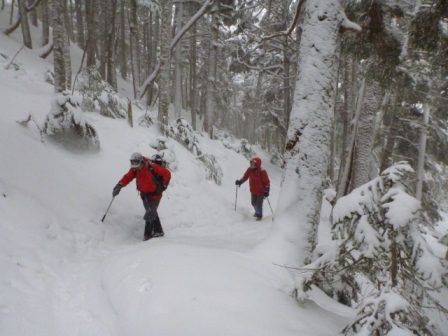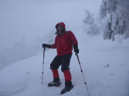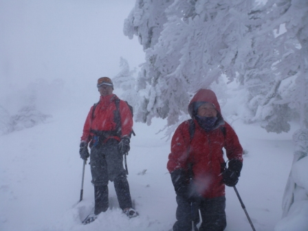ヒュッテ夏沢に到着すると、風は一層強くなった。硫黄岳に向かう足跡もある。一息入れ、硫黄岳へと向かう。先行する女性二人組を追い越すと足跡はなくなった。登るに連れ、風が強くなり、吹き付ける雪で顔が痛い。この先樹木もなくなってくる中、天候も回復しそうもないので山頂へ向かうことを中止し引き返すことにした。後続の大人数のパーティも同じように引き返すとのことだった。