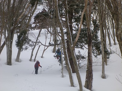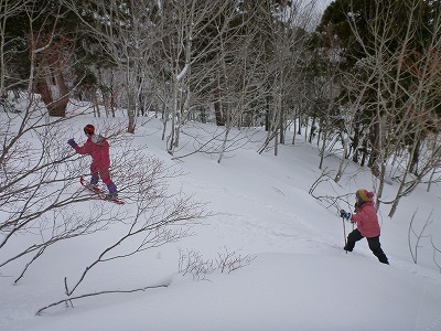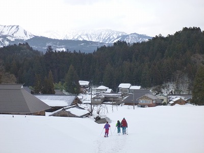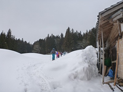 参加者は8名。集落奥の民家の脇から、それぞれワカンとスノーシューを装着して出発です。