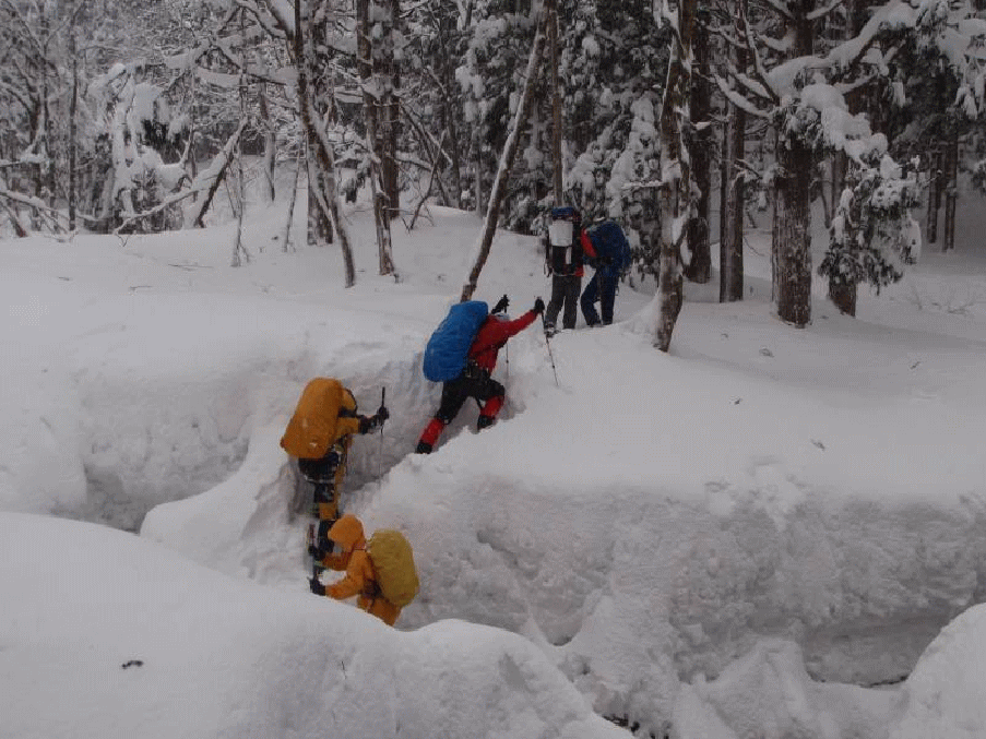 登山道のない裏五頭の無沢山に会山行を計画したところ、大勢の参加を頂いて総勢10名での山行となった。人数が多いと荷物も分担でき、又何より雪山ラッセルの機動力が違う。日本付近にはこの冬最大の寒気団が居座わっているとのことで昨日は大荒れの状態だった。今日も新潟市を出る時は雪が降っていたが、現地に着くと小康状態となり、青空も除く状態となった。道路脇の雪壁を登り、その上でスノーシューやわかんを装着する。本日はスノーシューが5人、わかんが5人だ。スノーシュー組みが先行しながら進む。