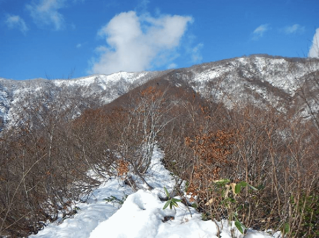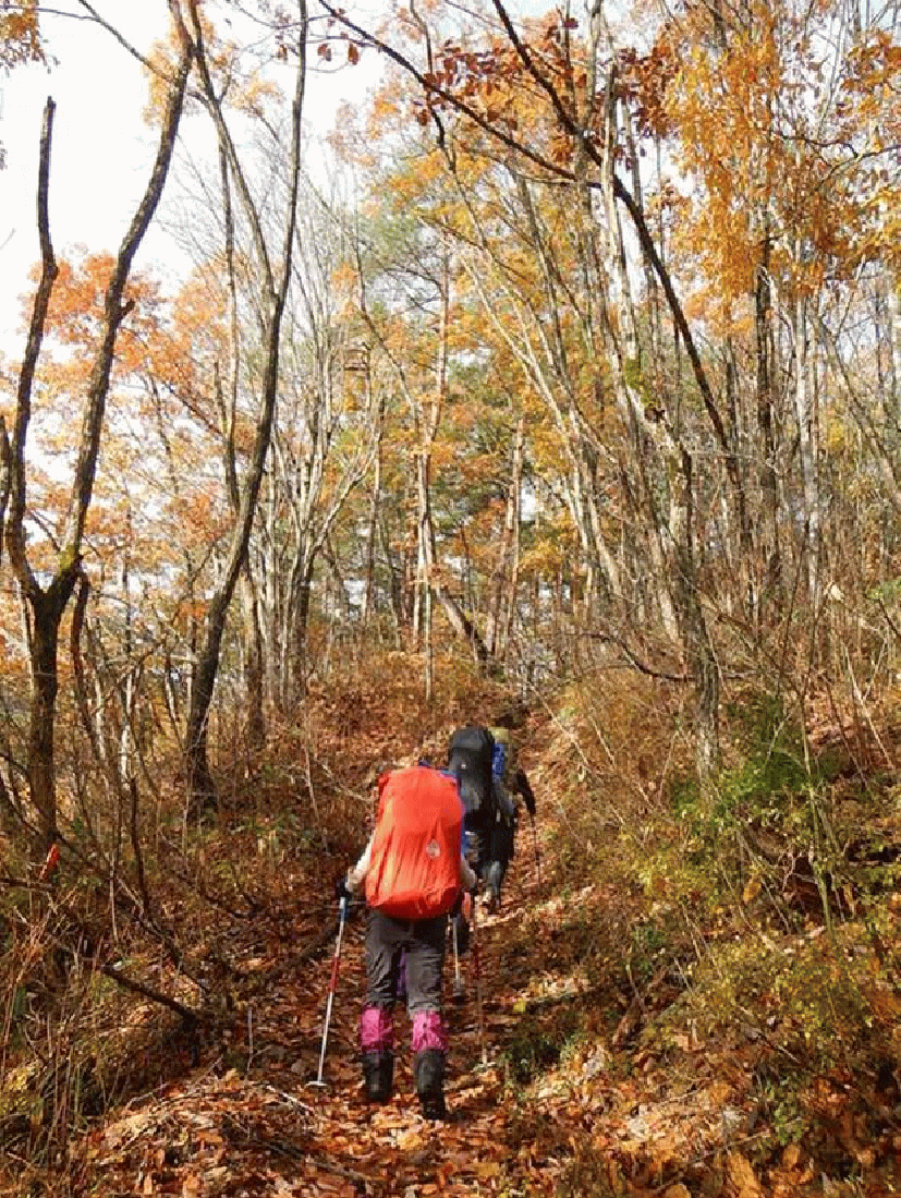 登りはじめは秋の山で紅葉も少し残っていた。ナメコやムキタケが多く登山道脇でも大量に採れる。こんなに容易にキノコが採れるのも珍しい。
