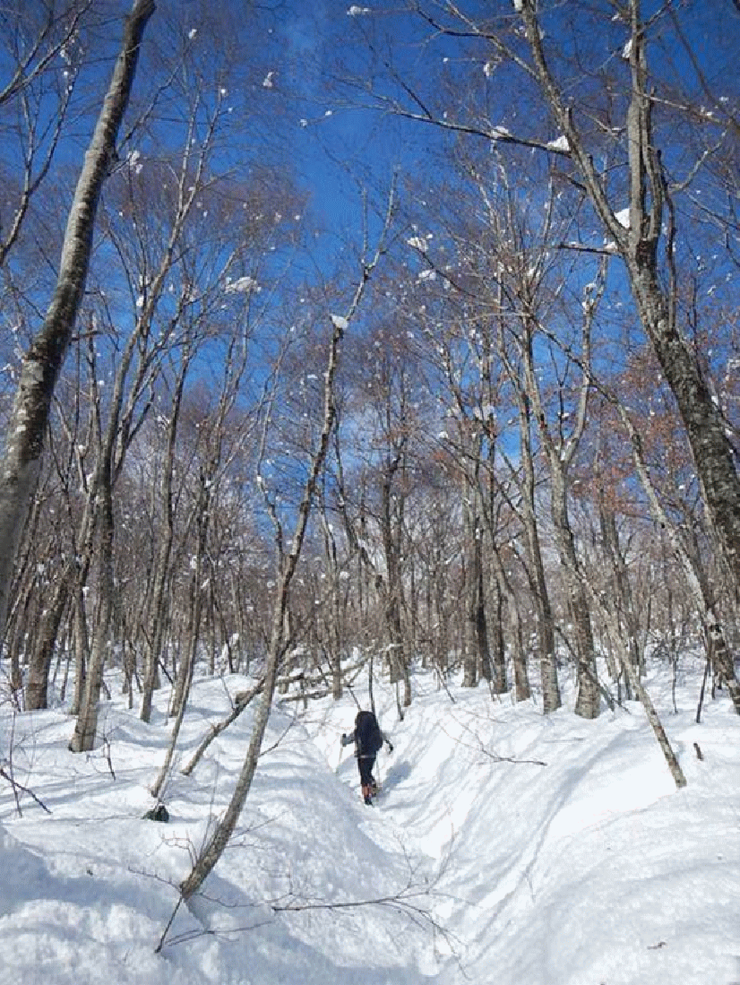 標高700mを超えたあたりから雪が出てきた。登るにつれどんどん増え、たまらずわかんを装着する。先行者が一人いるようで、足跡がありずいぶん助かった。