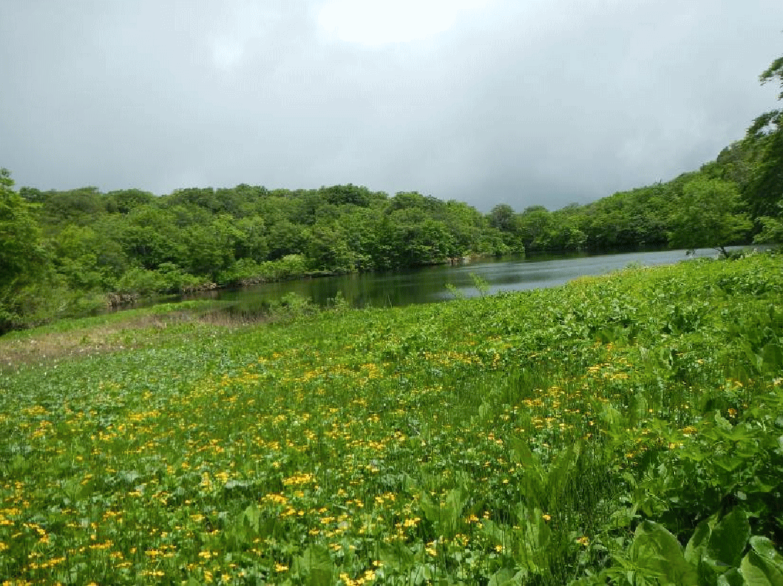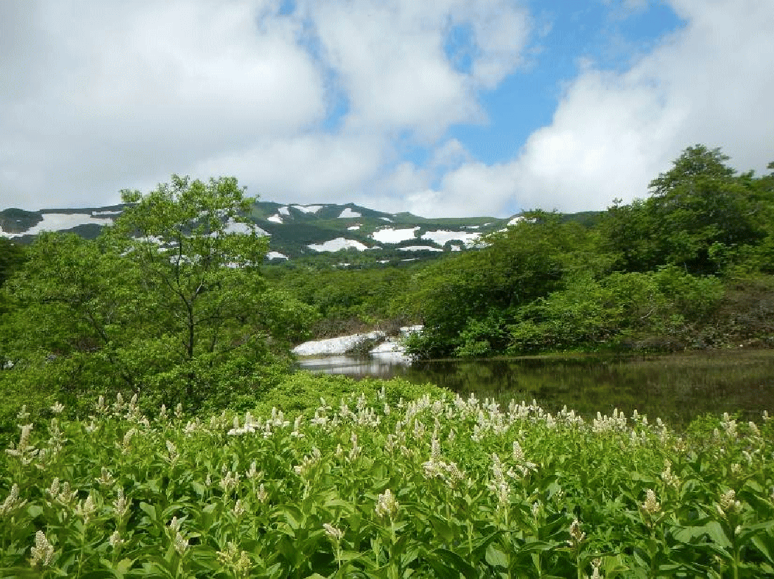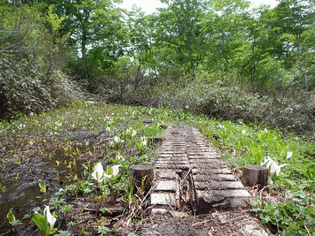 登りではガスっぽかった湖沼もくっきりと見え、花々も陽に映えている。豊富な水と豊かな土壌がみごとなお花畑を作り出しているのだろう。また、神秘的な池沼やブナ林なども素晴らしい。奥深い森の大自然を満喫できる山だった。静かな山という印象しかなかったが、一変してしまった。