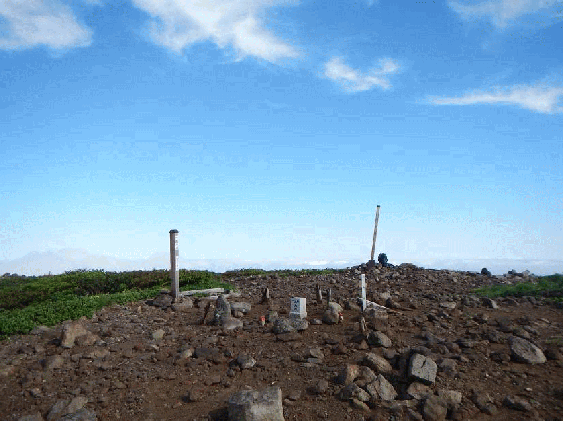1等三角点がある山頂は広く、360度の展望が得られた。雲の流れは速く、青空が見る見る間に広がってきている。周りの山々がまだ雲の中なのが残念。青空の下、焼石岳だけぽっかりと浮かんでいるようだ。登山者の往来が途切れ、誰もいない山頂でゆっくりとした時間を過ごすことができた。