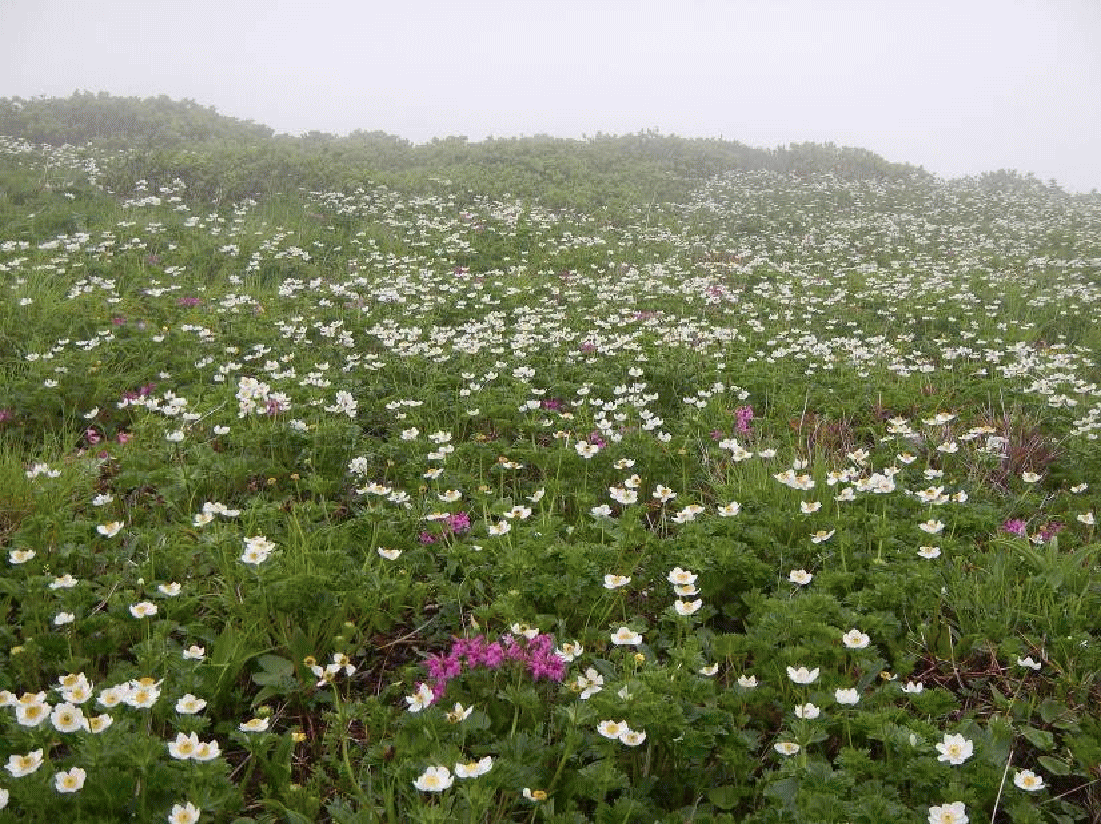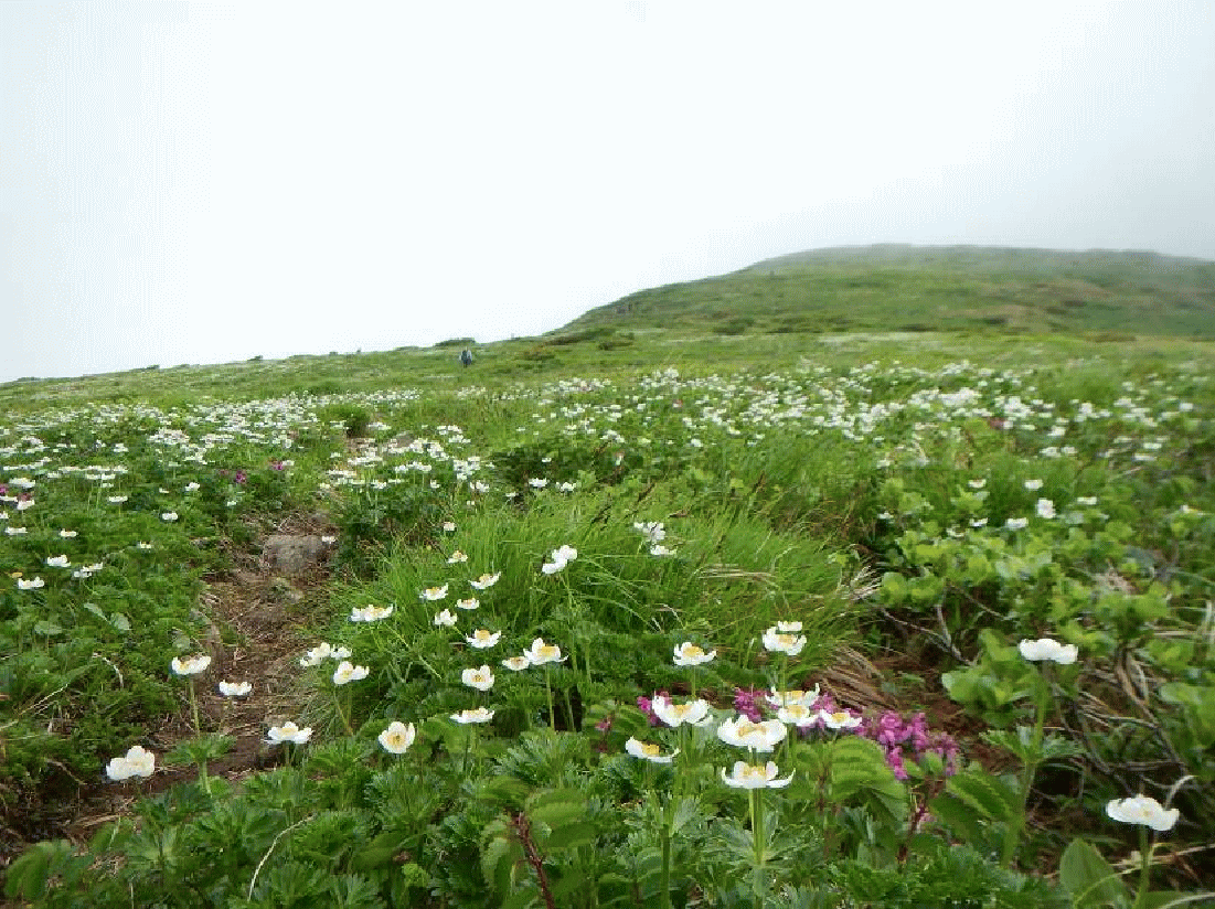 下りは北斜面の焼石神社を経由し、山頂を巻いて戻るコースとする。ガスがかかり始め、ヤブっぽい道ともなり、朝露でぐっしょり。東焼石岳の分岐近くでやっと人の気配がすると東焼石岳への分岐点で、広大なお花畑が広がっていた。ハクサンイチゲの花で斜面が埋め尽くされていた。