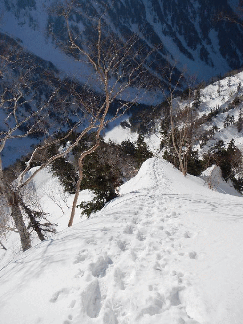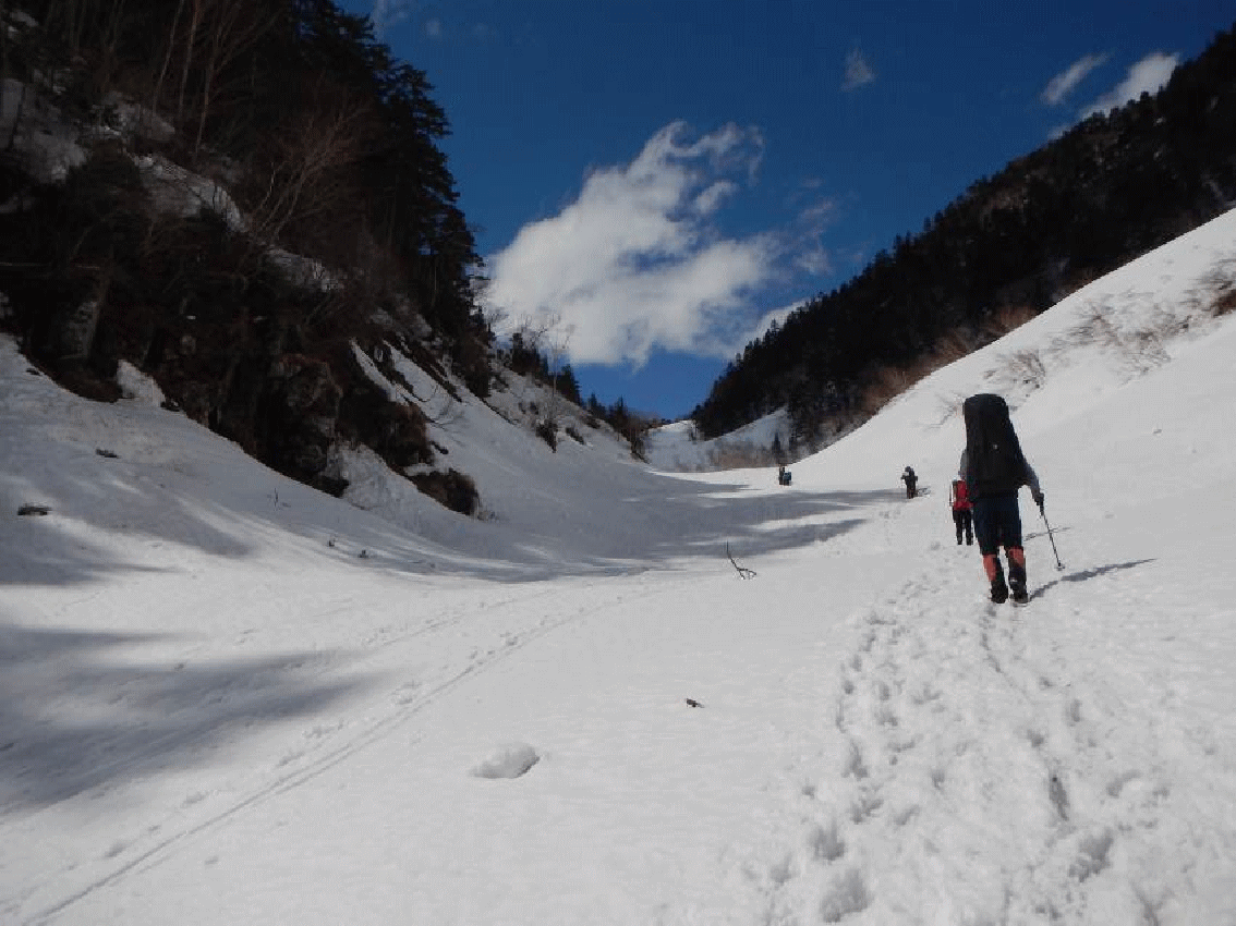 白出沢、滝谷出合と進む。滝谷出合からは雪の中の沢をつめるようになる。トレースもしっかり付いていて、歩き始めはいなかった登山者が目立つようになった。山スキーヤーもいる。中急斜面の雪道は歩きやすく、思いのほか早く槍平に着くことができた。