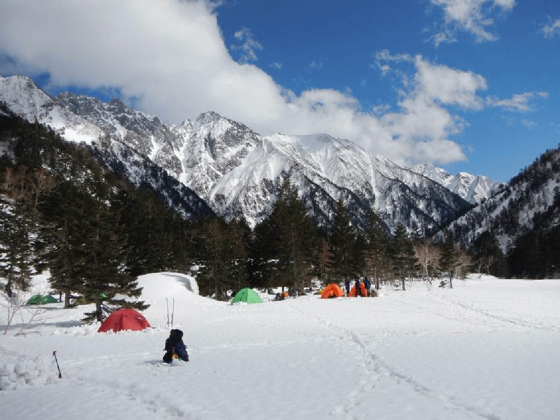 槍平には2〜30張のテントが張ってあった。槍平小屋はまだ営業していなく、冬季小屋のみ。私たちもさっそく雪のブロックを積み、幕営。その後偵察に出、水場を発見する。2.5mほど雪が掘られたところに小沢が流れていた。水作りをしないだけでも大助かりだ。