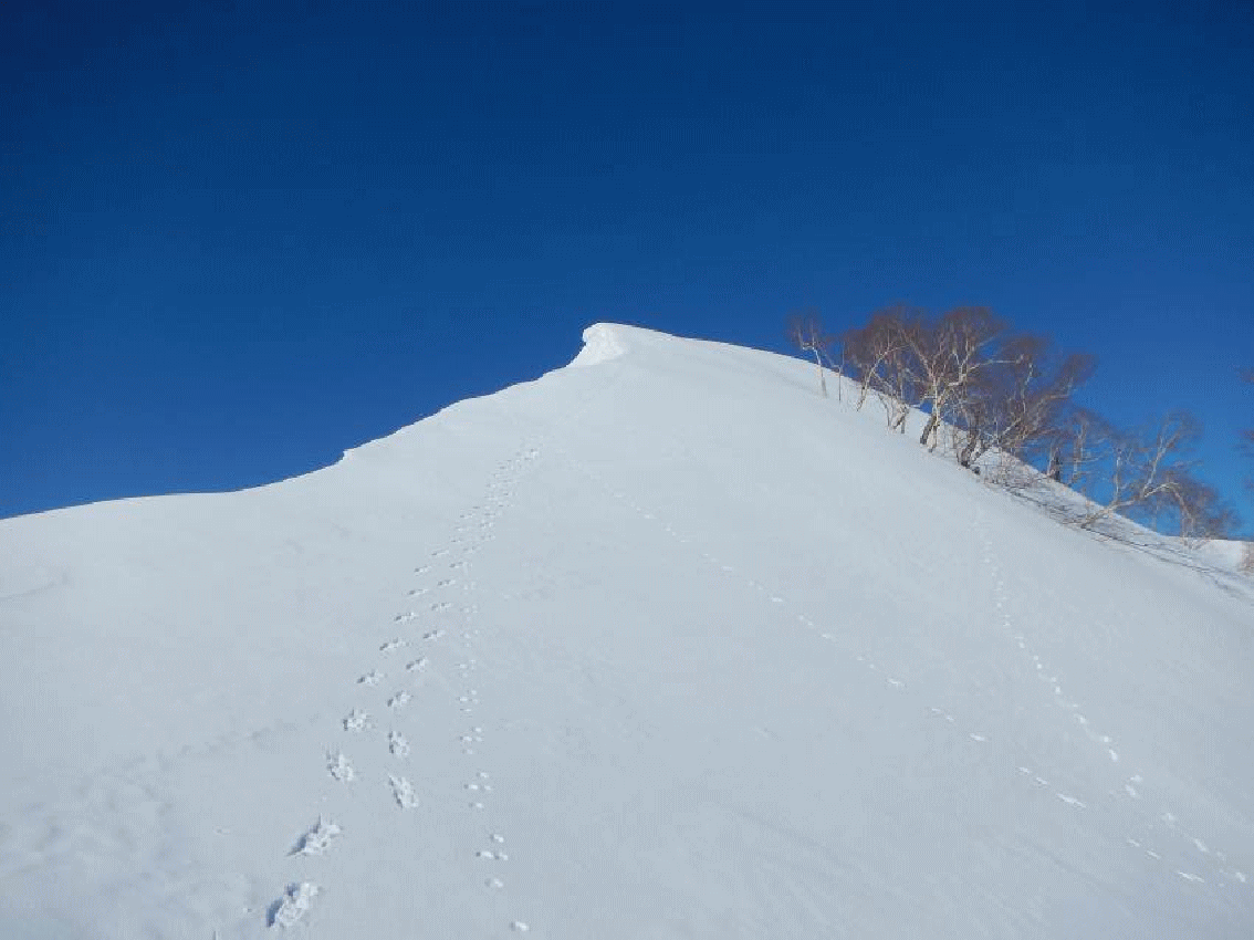 奥丸山へのルートにもしっかりとしたトレースが付いていた。登り始めからものすごい急登。それも針葉樹林帯なので、大分クラストしている。登りはアイゼンの爪を利かせ登るが、帰りが心配になる。樹林帯を抜けても急登が続き、やせた一本尾根上の雪道となる。振り返ると、穂高方面の山々が輝いて見える。
