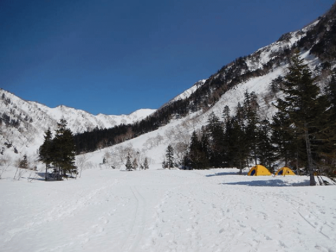 下りは雪が腐り始め、それほど怖くはなかった。最後の針葉樹林帯は沢側に入り、槍平に下りた。槍平は春の日差しでいっぱい。登山者は少なく、静かな山を楽しめる。ゆっくりとした時間を過ごした後、テントを撤収し、槍平を出発した。