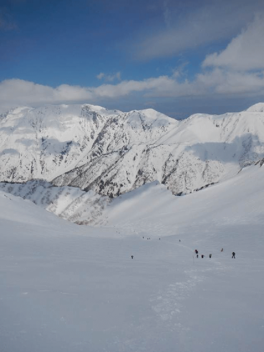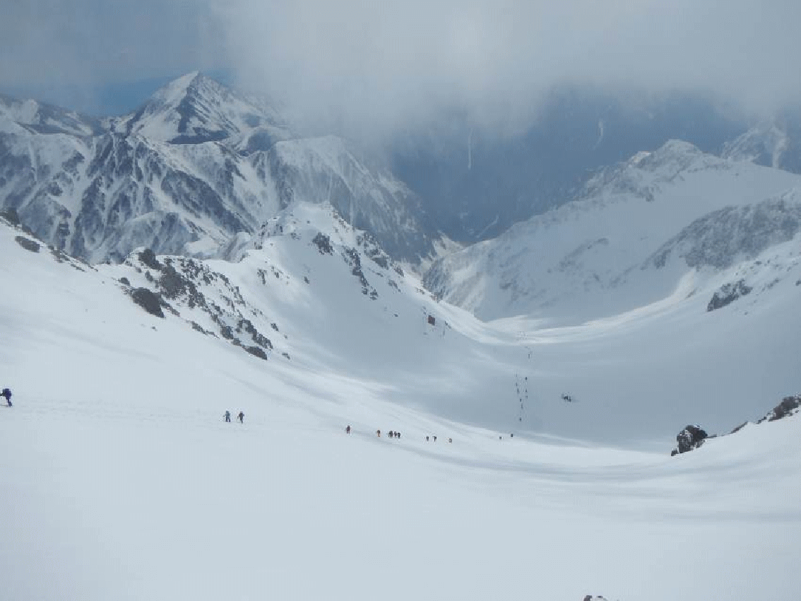 夜は満天の星空だったが、翌日は雲が多い天気となる。パーティーが続々と出発し、私たちも急かされるように歩き出す。飛騨沢は雪がたっぷりと付いている。雪は安定していて、アイゼンを利かせ高度を稼いでいける。振り返ると、奥丸山が低いながらもそびえ立って見える。沢の方角が変わり、傾斜がきつくなってくるころにはガスの中に入り、風も強くなっていた。