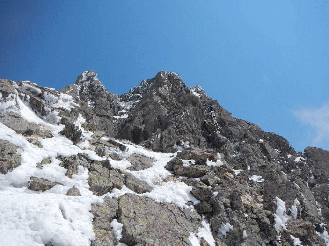 下りはより緊張した。アイゼンを付けながらのハシゴ段下りは慎重そのもの。岩場の一歩もゆっくりと慎重に下る。天気がやや安定してきたので、登ってくる登山者も多くなっていた。登り以上に時間をかけゆっくりと下っていく。槍岳山荘に着いた時は安堵と満足感でいっぱいとなった。