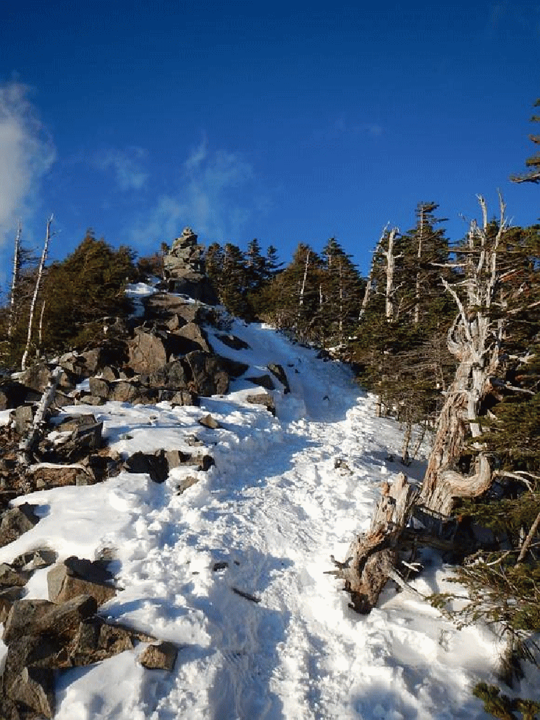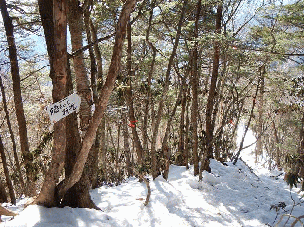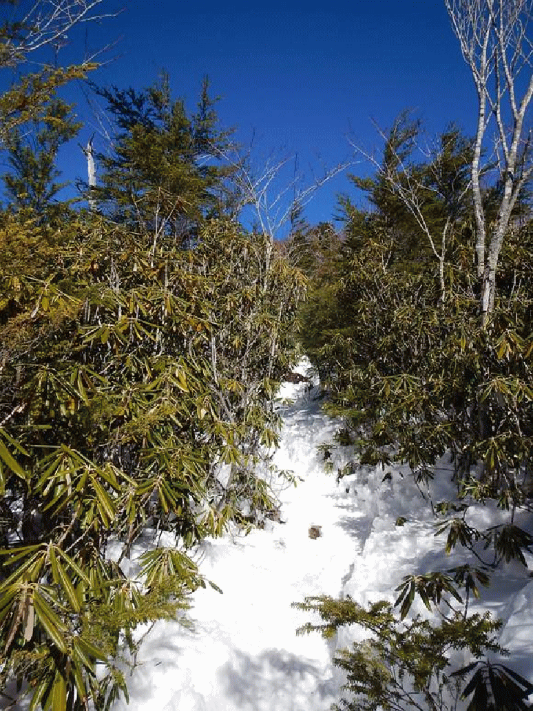 最初から雪道で、すぐに急登となる。唐松林を抜け顕著な尾根道となったところで、アイゼンを付ける。新潟では見られないシャクナゲの大木のトンネルの中を行く。やっと傾斜が緩んだところが、近丸新道の分岐だった。下ってくる登山者は多いが、登りは私たちだけ。