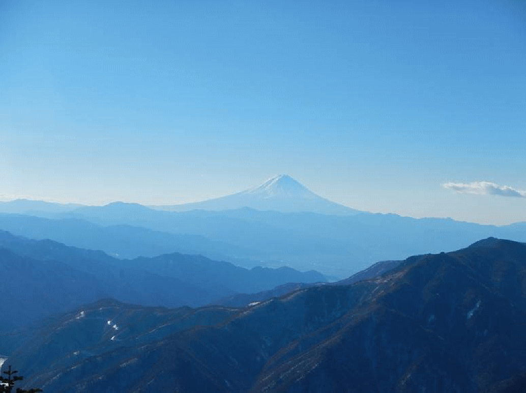 途中のガレ場で、富士山が遠いけれど真正面に見えた。昨日よりも大きく、光っている。昨日は広瀬湖しか見えず、思わぬ光景に大歓声をあげる。陽も暖かく気持ちが良い。やはり、お正月は天気のよい中、ゆっくりとまどろむことができる山が一番だ。登りの時間とそう変わらない時間をかけて下った。
