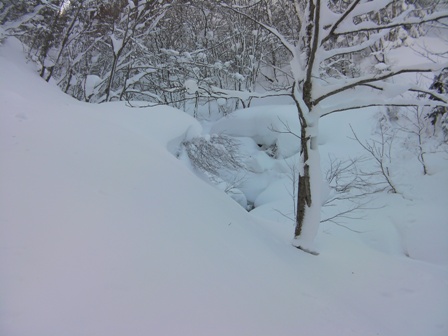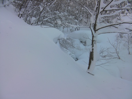 1時間以上も歩くと,ようやく標高970m付近にある落橋した橋に至る.ここで最初の休憩をする.板を外すと,腰近くまで潜る.降ったばかりの新しい雪だ.