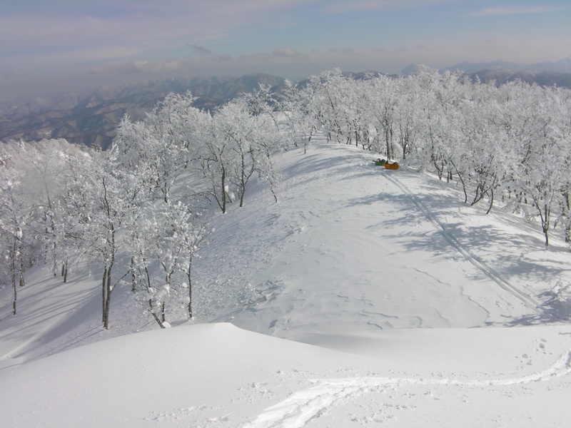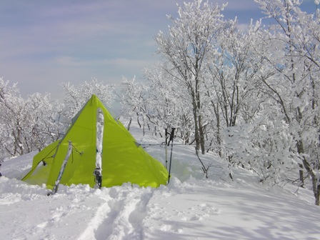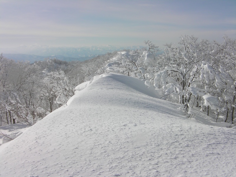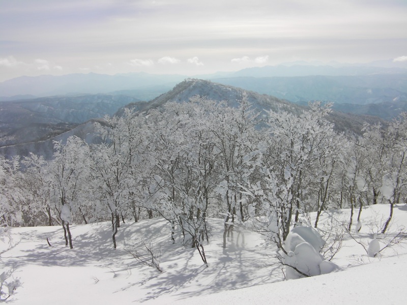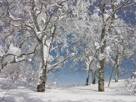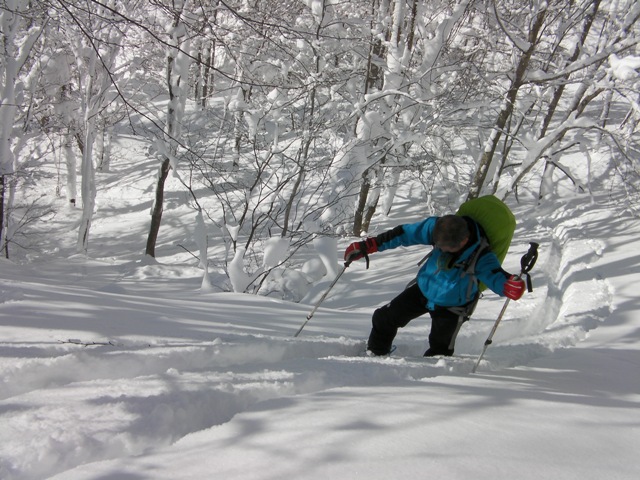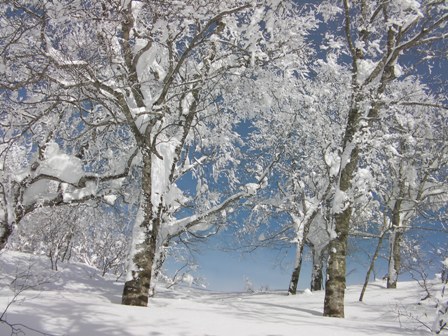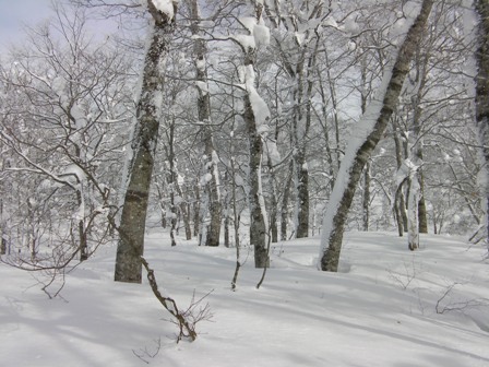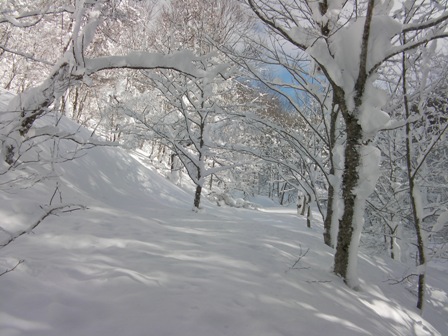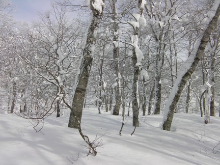 黄金沢の源頭は,ひたすらブナの林である.それほど大きなブナはないが,手つかずの自然な感じがする.稜線が近付くにつれ,雪を纏ったブナが青空に映える.