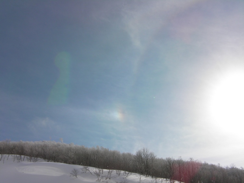 標高1300m付近で本コースの核心部に至る.ようやく林道歩きから解放され,開けたブナの林を歩くことができる.どこでも歩き放題である.ふと,振り返ると王博士の上空に彩雲が出ていると思ったが,よく見ると,なんと幻日である.現実の幻日を見るのは初めてのような気がする.