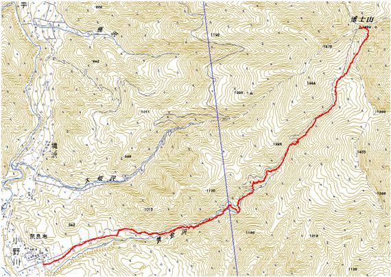 奈良布(標高760m)8:13 − 標高970m橋 <休憩> 9:30〜9:41 − 標高1210m 林道<休憩> 10:47〜10:58 − 山頂12:18 <昼の憩> 13:50 − 奈良布14:35