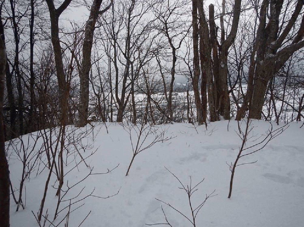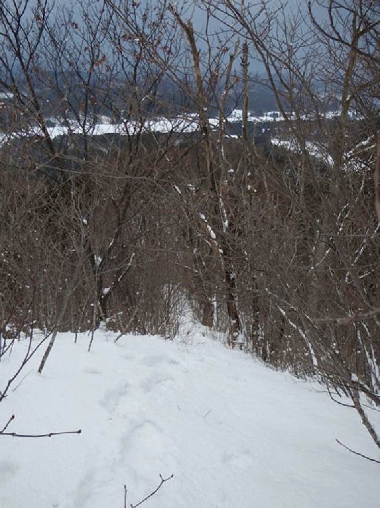 天気は冬型で曇り。上土沢集落の奥、林道の入り口に車を止め、スノーシューを付け歩き始める。雪は固まっていて、歩きやすい。30分ほどで送電線の下に着き、ここから山の斜面に入る。標高200メートルで顕著な尾根に出、明確な尾根歩きとなる。夏道があるような尾根で、ヤブも気にならない。