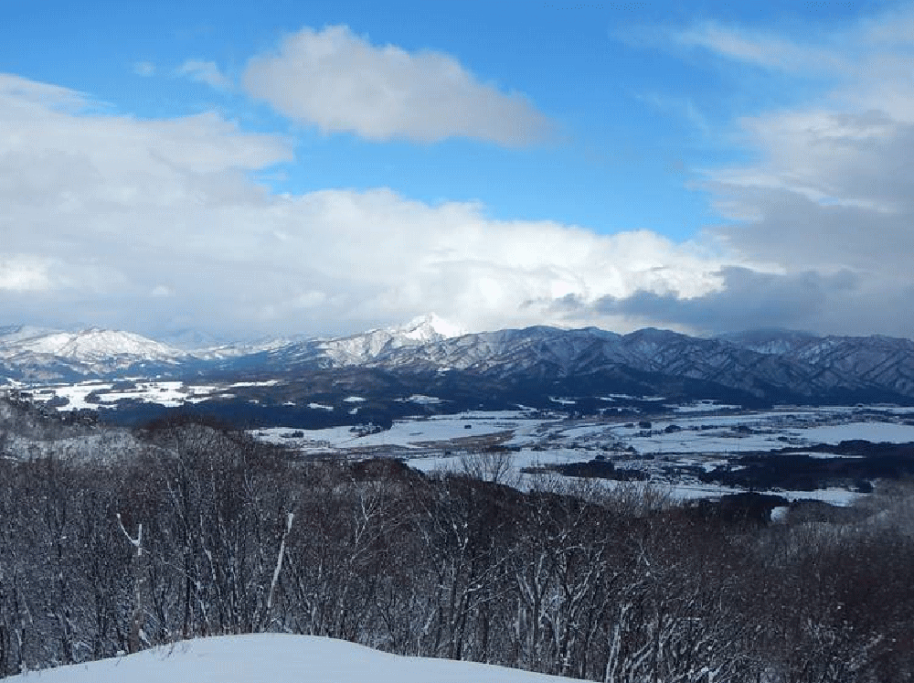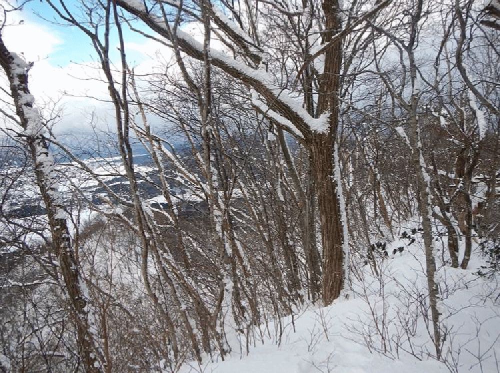 主尾根からは海方面が開けて見える。緩やかな尾根歩きだ。ここまで来ると、雪質も変わりサラサラ雪となる。20cmほどのラッセルで気持ちの良い稜線歩きだ。天気はというと、雪雲が走っているようで、吹雪になったり青空が出たり、目まぐるしく変わる。