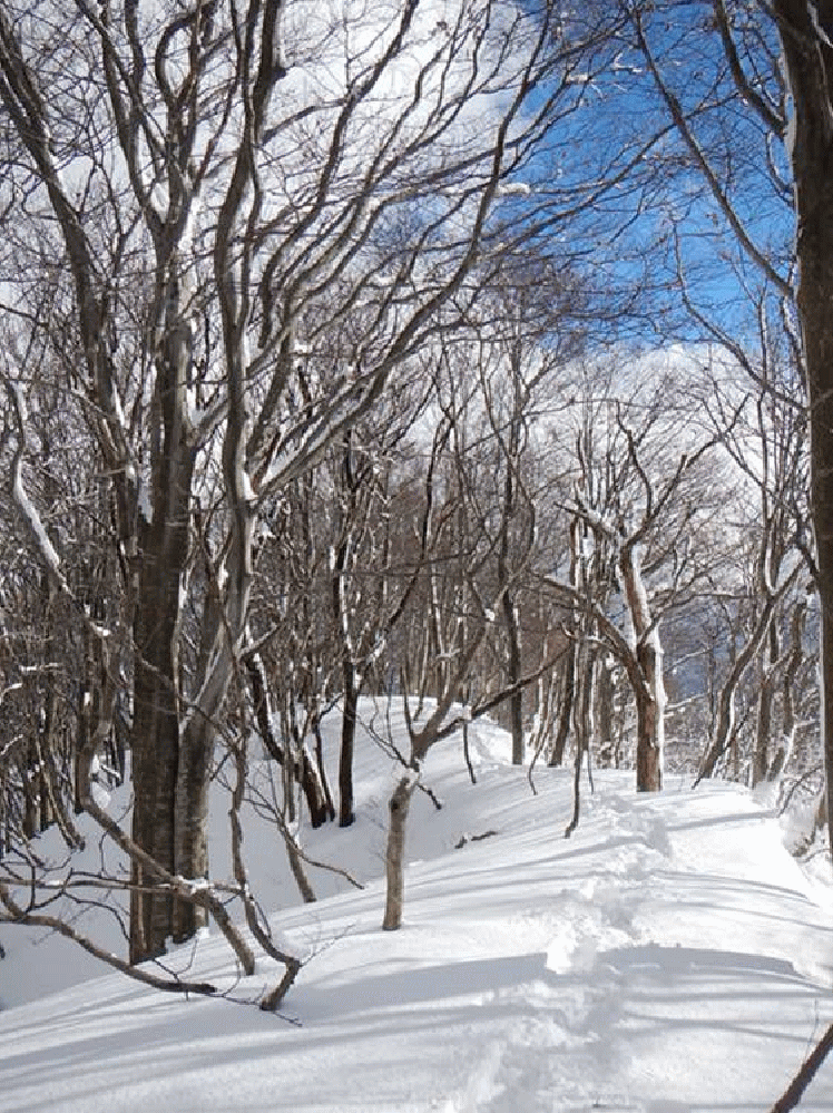 高坪山一帯はブナの林だが、北側も同じようにブナの林が広がっている。時折見せる青空がブナの木々をよりいっそう美しく見せてくれる。この尾根上には目印テープが所々付いている。積雪期に歩く人がいるのだろうか。なんとなくうれしい。
