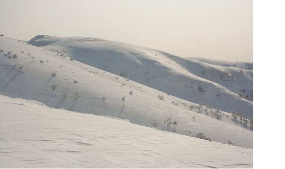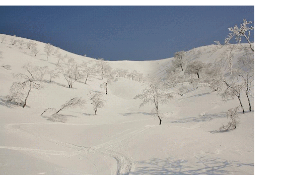 大岳頂上も風が強くてあまりゆっくりできないので、すぐに降りることにする。頂上から吸い込まれるようにコウクルミ沢の源頭部に滑り込む。アイスバーンにエッジがよく効く。うれしいことに沢の底には前日降った新雪が残っていてパウダーも楽しめた。