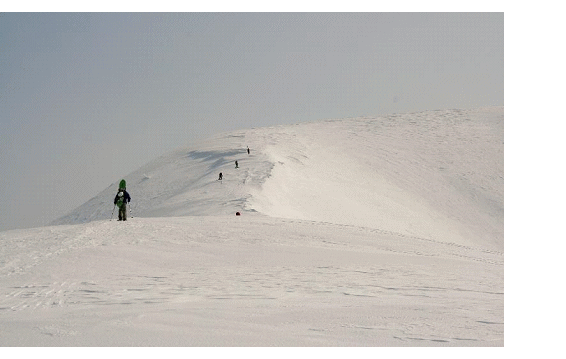 ブナ林の中にはうっすらと新雪が残っていて気持ちよく歩けたが、樹林帯をぬけるとアイスバーンになりスキーアイゼンを付けて登る。すでに頂上まで行ってきたスキーヤーがガリガリ氷を削りながら滑り降りてくる。尾根上は少し風が強いが、守門岳の雄大な斜面が見渡せる。